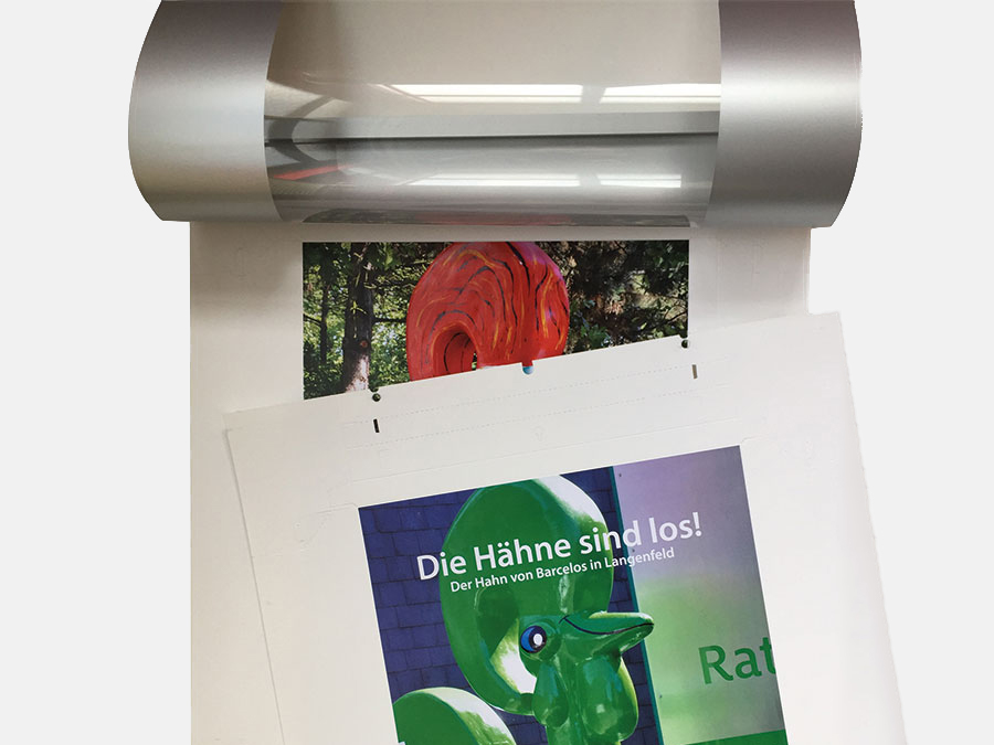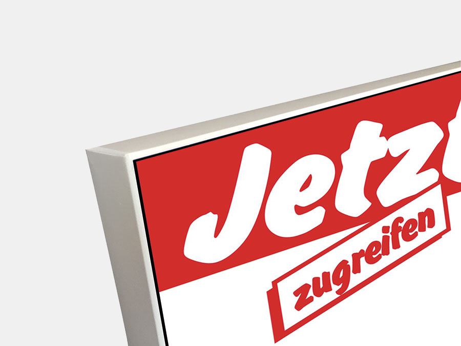 - Werbedisplay: Nutzen Sie den Bildträger als Wand- oder Deckendisplay zur Selbstbeschriftung oder zur Bedruckung Eine Gegenverklebung von zwei Rückseiten ermöglicht es sogar einen beidseitig lesbaren Werbeträger zu gestalten.